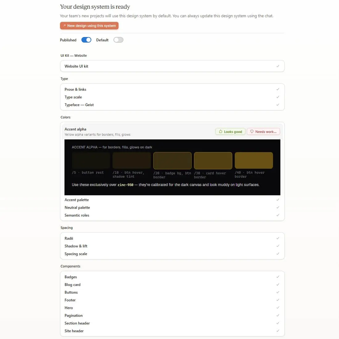 A working design system was born directly from what already existed. I wasn't inventing something new, the generated system already felt recognisable.